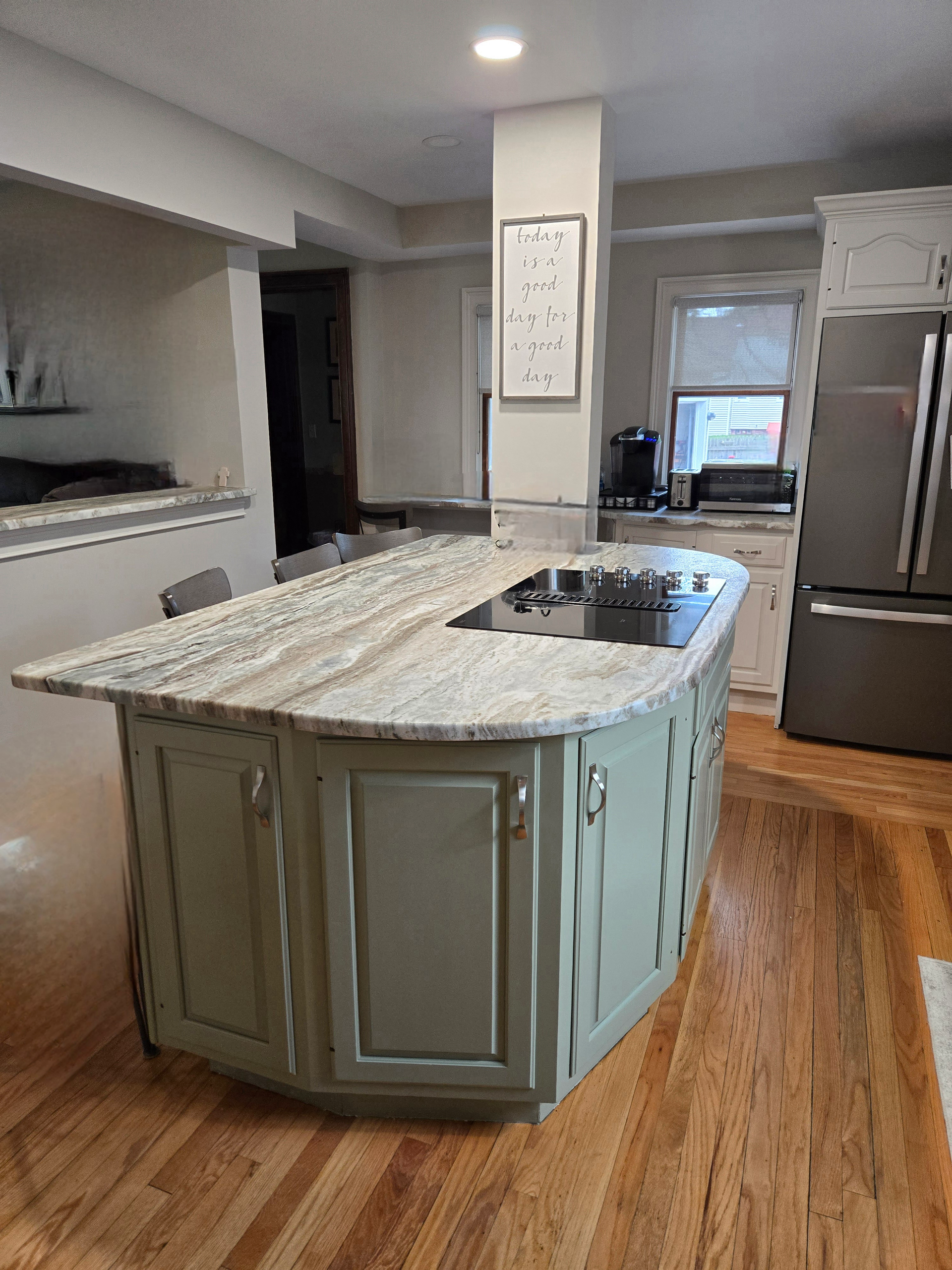 We chose a beautiful granite called 'brown fantasy' in a leathered finish. We reduced the size to a more reasonable 4' x 8' for the island, which allowed better flow for moving around the space.