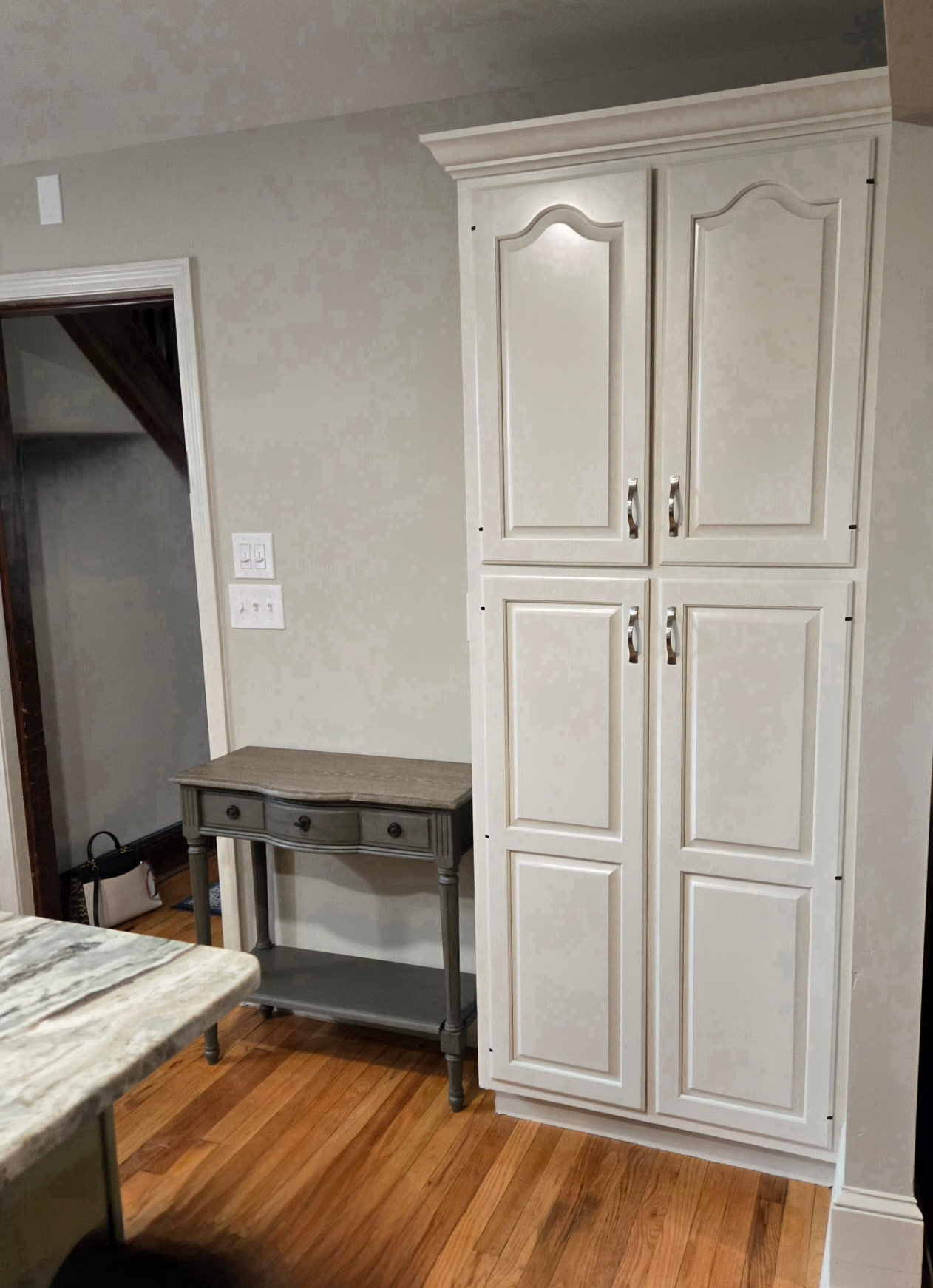 We decided to paint the the cabinets in BM Pale Oak and the island cabinets were painted BM Raintree.